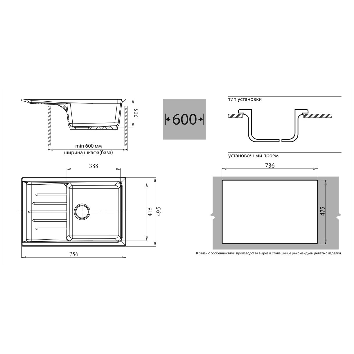 Общий размер мойки