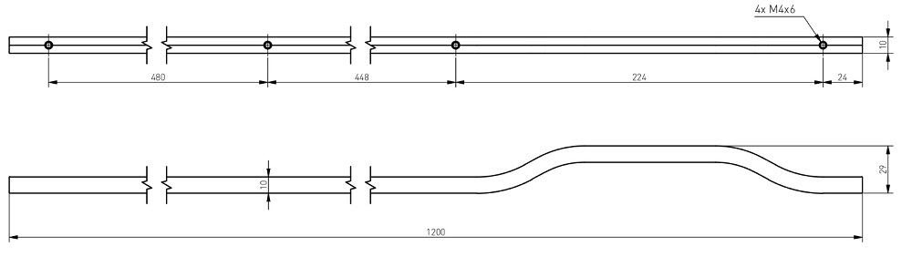 Ручка крепится на 4 винта, что обеспечивает надежное закрепление и долговечность использования. Межцентровые расстояния на ручке 1200 мм составляют 224, 448 и 480 мм, что позволяет легко адаптировать ее под различные мебельные решения.