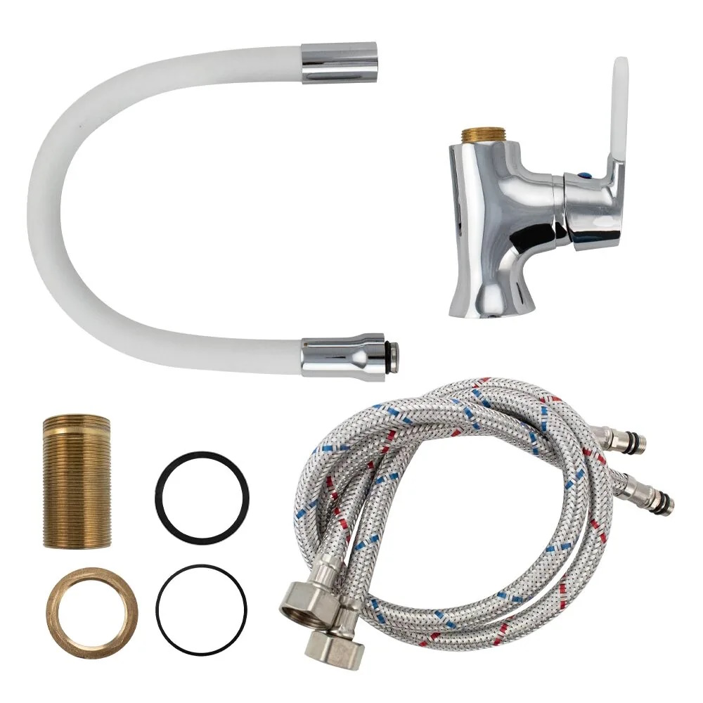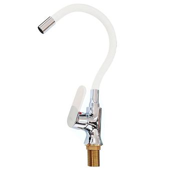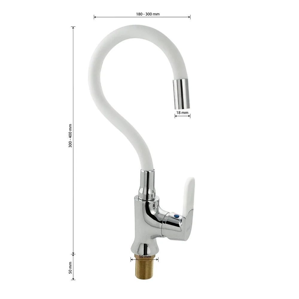Смеситель для кухонной мойки и раковин, хромированный, боковой, шаровый d = 40 мм, массивный корпус с гибким изливом белого цвета, с аэратором для экономии воды. Материал изготовления — ЦАМ (цинк-алюминий-медь). Крепление резьба - гайка, литая ручка с силиконовой накладкой. Габаритные размеры: высота 300 - 400 мм, длина 180 - 300 мм, диаметр посадочного седла 50 мм, длина резьбы 50 мм, длина подводки 600 мм. Вес - 1,500 кг, объём - 0,00510 м3. В комплекте корпус с изливом, паспорт, подводка 1/2, крепёж. Габаритные размеры коробки: ширина 295 мм, высота 65 мм, глубина 185 мм.